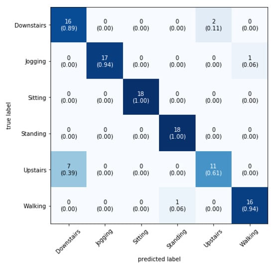 Finally, the six activities are predicted using a confusion matrix. For this, the test data are passed in an appropriate function, and as a result a 6 × 6 matrix is obtained with the diagonal squares containing the probabilities of recognition of each of the six classes (See Figure 9).