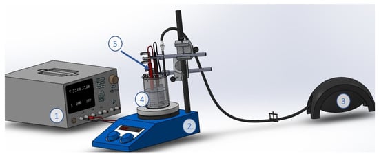 Experimental device for anodic oxidation and electro-Fenton-like process. (1) current power supply, (2) magnetic plate, (3) air pump, (4) cylindrical electrochemical cell and (5) electrodes.