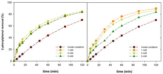 Figure 2a shows the degradation profiles of 2-phenylphenol in the three electro-Fenton tests carried out in comparison to the anodic oxidation test, used as control experiment. BDD electrodes have great characteristics that distinguish them from other materials, such as high oxygen evolution potentials, inert surface with low adsorption and very low double layer capacitance and background current. Thanks to its properties, BDD anodes attain higher oxidation rates and mineralization efficiencies, producing •OH from water electrolysis (Equation (8)) that are strongly adsorbed on its surface and unselectively attack the 2-phenylphenol.