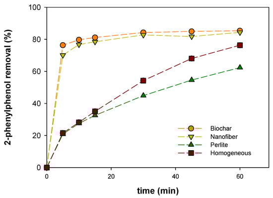 Figure 4 shows the 2-phenylphenol removal profiles using the different catalysts tested in this study. It is clear that with catalyst supported in nanofiber and biochar the removal levels achieved after 5 min are quite similar (70–75%) which could be explained by the adsorption of the pollutant in the carbonaceous materials (biochar and nanofiber).