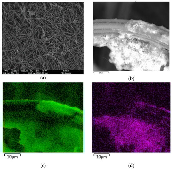 Detailed SEM image of an electrocatalyst containing carbon black, nanofibers, PTFE and nickel (a,b) and EDS analysis: fluorine (c) and nickel (d).