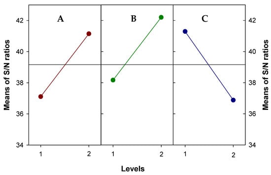 The performance of the method outputs is optimized in relation to the response’s signal/noise ratio (S/N) which decreases the variability of the process. In this method, S/N represents the measurement of the deviation of the response from the desired value. A lower variability in the process is ensured through maximizing the S/N ratio, and in this study, the larger-the-better category (Equation (5)) was selected.
