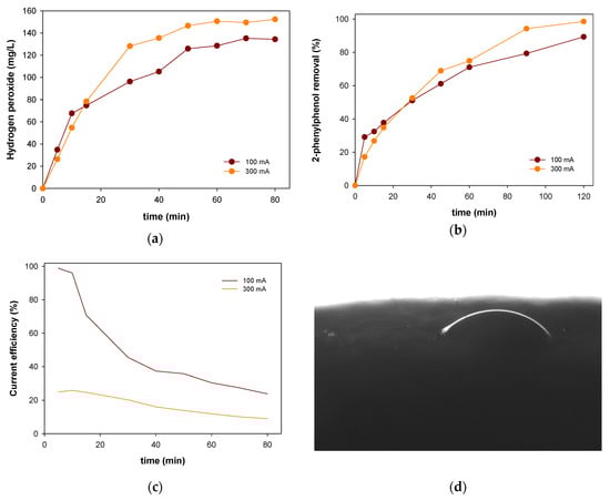 Profiles of hydrogen peroxide (a) and 2-phenylphenol removal (b) using the optimized electrocatalyst in electro-Fenton-like process at 100 mA (marron) and 300 mA (orange) and current efficiency evolution along time (c). Water contact angle determined by drop assay (d).