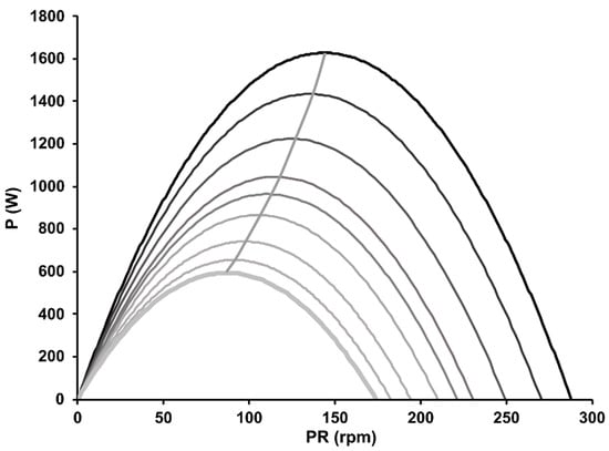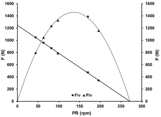 In cycling, the fatigue-free F/v and P/v profiles represent the maximal resistance an athlete can overcome at a certain cadence and the maximal power output at that cadence and allow important parameters of neuromuscular performance to be determined, including the theoretical maximal mean crank force (Fmax, as the F/v intersection of the y-axis) and cadence (PRmax, as the F/v intersection of the x-axis), maximum power output (Pmax, as the P/v apex), and optimal cadence (PRopt, as the pedaling rate corresponding to Pmax) [].