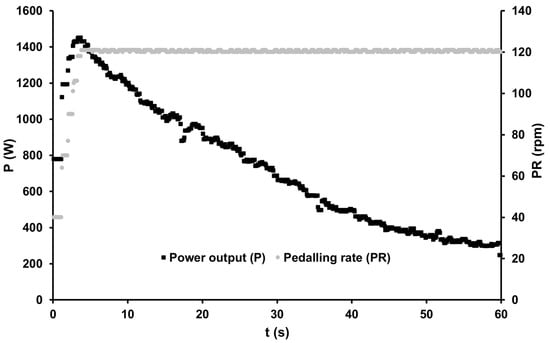 After a short period of acceleration, all of the athletes attained the specified cadence of 120 rpm and completed their 60-s sprints with an average power output of 735.15 ± 56.62 W. Figure 2 illustrates the typical time course of power output and corresponding cadence for one of the athletes.