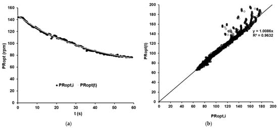 (a) The optimal dynamic cadence as a function of time reflects the increase in fatigue with prolonged cycling. Black points: current optimal cadence calculated for data point i (PRopt,i) calculated using Equation (4). Grey curve: time-dependent optimal cadence (PRopt(t)) calculated using Equation (5). The amplitude A was 85 rpm, the time constant τ was 38.20 s, and the limiting value was c = 55.43 rpm with a time delay of 2.98 s. (b) Comparison of measured and modelled data via linear regression analysis.