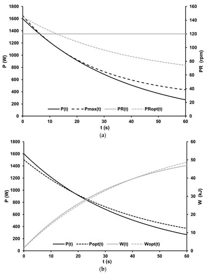 (a) Time-dependent maximal power output (Pmax(t)) at dynamic optimal cadence (PRopt(t)) and power output (P(t)) during a 60-s all-out sprint at a cadence of 120 rpm (PR) on a cycle ergometer. (b) Comparison of the time-dependent power output (P(t)) at a pedaling rate of 120 rpm and the corresponding work performed (W(t)) to optimized power output (Popt(t)) at a mean optimal pedaling rate of 102 rpm and the corresponding work performed (Wopt(t)) during a 60-s all-out sprint on a cycle ergometer. In fact, free optimization of the mean power output by altering the cadence during the isokinetic test resulted in a calculated mean optimal pedaling rate of 102 rpm. Changing the cadence to 102 rpm would result in a 7% higher mean power output of the athlete in the isokinetic test mode.