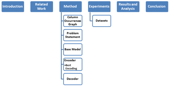 A similarity measure has been described to capture scores from the column co-occurrences graph effectively. We have performed experiments with a text-to-SQL task on the Spider dataset. The Spider dataset and its difficulty categorization and criteria are explained in Section 5. Our experiments show that our approach improves exact match accuracy. We have compared our results with a base model of SyntaxSQLNet and two other contributions that have implemented preprocessing on input feature vectors and integrated with SyntaxSQLNet [14,15,16]. We show that our work improved accuracy up to 10% in an experiment with BERT embedding. The rest of the paper is constructed as shown in Figure 3 below. Table 1 in the following contains all the acronyms used in the article.