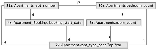 First, we introduce the column occurrences graph. Following the idea of [32], the column occurrences graph is built from the query log or, in the Spider dataset case, from the previous SQL queries of a particular database in the training data. Example of such set of queries is shown in Figure 4. Figure 5 shows the columns occurrence frequency in the set of queries. Figure 6 shows the columns occurrences graph, where nodes represent the frequency of individal column occurrence and edges represent the co-occurrences of the comuns. The intuition of this graph is to capture the user’s intention for clearer column prediction. Primarily in cases when the exact column name is not mentioned in the text question, prediction of one column can assist in predicting the other columns as well. Our method is an extended version of [32], in that we compute occurrences and co-occurrences of columns specifically, explicitly excluding the “from” part of queries to avoid noise and repetition. Instead, tables are concatenated with their column names, column types and relations, following the encoding method of [27]. Graph G contains edges, e, representing the column occurrences and vertices, v, representing co-occurrences of the involved schema elements in a particular database’s query sets to capture this intuition. Following the idea of [32], the Dice similarity coefficient is used to reflect columns co-occurrences as follows: