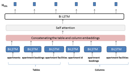 The word embedding of question tokens, the schema, and history tokens is obtained from a pretrained GloVe [18] embedding. The current decoding history is further encoded with a biLSTM, denoted by HS [27]. We adopted the idea from [33] for schema encoding to capture self-attention of the schema elements. Schema encoding starts from obtaining the embedded column names, whererafter table names are embedded, as are column types. These initial embeddings are concatenated together. Self-attention is used between columns to capture the internal structure of the schema more effectively, where table names are also integrated. In the self-attention layer, another layer of biLSTM is applied to connect them and denoted as . The table schema encoding process is portrayed in Figure 7.