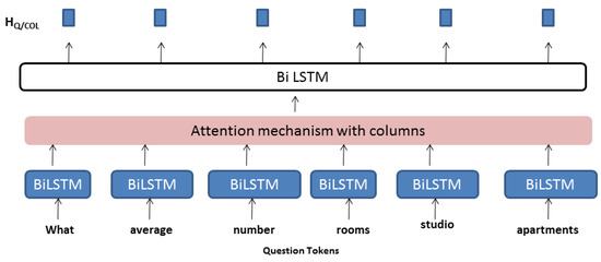Following [27], after tokenization and GloVe embedding, the natural language question is encoded with biLSTM. To effectively capture the meaning and context of natural language questions fully with respect to the available column and tables in the database schema, an attention mechanism layer is applied, with the outputs of the hidden state of the question tokens’ biLSTMs and the columns’ biLSTMs, generating the . Figure 8 shows the NL question tokens encoding process.