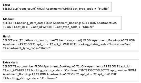 This cross-domain and multitable dataset also introduced difficulty levels for model evaluation. Difficulty criteria contain a set of rules. The presence of particular rules decides the difficulty of the query from among easy, medium, hard and extra hard [36]. Figure 9 below shows the examples of easy, medium, complex and extra-hard queries.