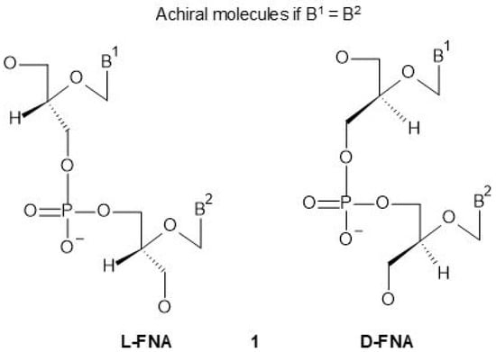 A single nucleotide unit consists of three segments that are chemically very different from each other. The heterocyclic nucleobases serve as acceptors and donors of hydrogen bonds and are responsible for proper intermolecular recognition. In addition, stacking interactions are important in conferring a high degree of rigidity to oligomers and higher-order structures. The anionic phosphodiester groups are reasonably stable under mild hydrolytic conditions, but they are important for hydration and may be involved in electrostatic interactions with positively charged amino acid side chains and other cationic species. Not to be neglected is the electrostatic repulsion between the phosphate moieties present in the oligonucleotide chains forming a complex, which contribute to the rigidity of the entire DNA or RNA system. The third component comprises of sugar moieties (ribose or 2′-deoxyribose), which are present in the cyclic form. Notably, the pseudo-rotational flexibility of the ribonucleotide is considerably limited due to the anomeric effect, and RNA/RNA and RNA/DNA duplexes are generally more thermally stable than DNA/DNA duplexes. The rigidity of the cyclic scaffold has been considered important for the formation of thermally stable duplexes [1], and the unexpectedly high thermal stability of duplexes formed with the participation of LNA oligomers could serve as an excellent justification for this point of view. However, this generalization is not consistent with the behavior of Peptide Nucleic Acids (PNA), in which the heterocyclic bases are attached to a linear peptide-like backbone, since duplexes composed of RNA or DNA and PNA strands are far more stable than RNA/RNA and DNA/DNA ones. This phenomenon may be attributed to the absence of a negative charge in the backbone, such that the absence of repulsive interactions balances the entropic cost of proper spatial organization of the flexible PNA scaffolds. Nonetheless, the widely accepted importance of the cyclic sugar components for the stability of the duplexes could be questioned. There is another perspective that can be applied to the acyclic analogs of nucleic acids that is related to the origin of life. We are currently witnessing an ongoing dispute about which molecule, DNA or RNA, was the first to mark the beginning of life in its modern form, i.e., were the first carriers of the contemporary genetic information. However, even if the correct answer is finally found, there is still the question of its possible predecessors. The first suggestion that oligomers with an acyclic flexible scaffold carrying pro-chiral nucleotide analogs might play such a role was made in 1987 by Joyce et al. [2]. These flexible structures seemed to be easier to produce than deoxyribo- or ribo-nucleosides under prebiotic conditions. To assess the possibility of their involvement in, for example, primer extension experiments, which could be considered the simplest biochemical probe showing a “living-like” system, chemists had to make several model compounds. Thus, both perspectives triggered efforts to synthesize and evaluate numerous acyclic analogs of nucleic acids, and it must be admitted that in several cases, very astonishing properties were found. They may be used not only in biochemical probes but, perhaps in the somewhat distant future, also in medicine and outside biology, e.g., in nanoelectronics. This review aims to summarize these synthetic efforts and to provide information on the most interesting properties of selected classes of such compounds. The selection includes the following types of analogs: