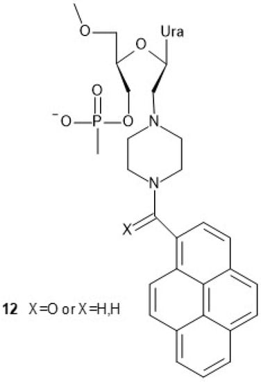 UNA-nucleotides have also been tested as fluorescently labeled compounds to be used as sensitive probes in molecular biology or nanotechnology. Two pyrene-modified UNA monomers were synthesized and incorporated into 21-mer DNA oligonucleotides [29]. Pyrene is a widely used chromophore due to its long fluorescence lifetime, high sensitivity and ability to stabilize DNA duplexes. The reported units differed in a linker between the 2′-(piperazin-N-yl) moiety and the pyrene molecule, which was either an amide (12, X=O, Chart 3) or an alkylamine (12, X=H,H). It was found that both pyrene-UNA-U units increased the duplex stability compared to UNA monomers, although the corresponding unmodified reference duplexes were still the most stable. Thermodynamic studies showed that they were able to discriminate mismatches well. Pyrene excimer emission was observed in single-stranded oligonucleotides containing three pyrene-UNA-U units, which disappeared after hybridization with DNA. Interestingly, for the first time, the fluorescence intensities of oligomers containing acyclic pyrene-nucleotides were found to increase upon hybridization with DNA or RNA templates. The unit containing the alkylamino linker (12, X=H,H) was used to construct a quencher-free molecular beacon that showed an increase in pyrene excimer emission of more than 900% upon hybridization of a fully complementary RNA target. This probe enabled the detection of RNA in H1299 cells [30]. Two additional pyrene-labeled UNA-U were synthesized using 5′-O-DMT-5-iodo-uridine (13, Scheme 3), which was converted to regioisomeric UNA-5-(pyren-1-yl)-U (14 and 15) after cleavage of the C2′-C3′ bond. These compounds were converted into corresponding 3′-O- and 2′-O-phsophoramidite monomers suitable for the formation of 3′-5′- and 2′-5′-inter-nucleotide bonds, respectively [31]. Both units were found to destabilize i-motif structures at pH 5.2. Moreover, their presence in a DNA strand resulted in reduced thermal stability of duplexes formed with DNA and RNA strands, although to a lesser extent than with unmodified UNA monomers. In addition, a bis-pyrene-labeled UNA-U was synthesized (16, Chart 4) with one pyrene moiety attached to position 5 of the uracil and the other to the 2′-(piperazin-N-yl) fragment [32]. As with the mono-labeled compounds, the compound with two labels was found to decrease the thermal stability of both DNA/DNA and DNA/RNA duplexes, but the destabilization was less than in the case of the unmodified UNA monomers. This compound also exhibits high mismatch discrimination. The UV/Vis absorption and molecular modeling studies allowed to conclude that the pyrene units are localized in the major groove of a duplex and do not intercalate with the nucleobases.