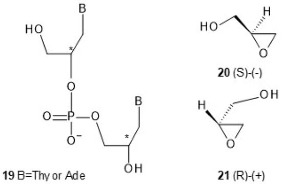 Structurally simple and synthetically relatively easily accessible acyclic glycol nucleic acids (GNA; 19, Chart 5, B=Thy or Ade, a dinucleotide is shown) were obtained by Meggers and coworkers in 2004 and reported in 2005 [34]. Note that unlike FNA and UNA, a GNA scaffold contains stereogenic centers (marked with the asterisks in 19) and GNA units can exist in R and S forms. Fortunately, the enantiomerically pure substrates, i.e., (S)-(−)-glycidol (20, Chart 5) and (R)-(+)-glycidol (21), are commercially available. After dimethoxytritylation, the DMT derivatives were successfully ring-opened with the unprotected thymine and adenine. The adenine derivative was benzoylated at the exocyclic amino group, and the product and thymine derivative were converted into the final phosphoramidities, which were further used in the solid-phase synthesis of 7 oligomers, each 18-nt in length. Their sequences allowed the study of the formation of antiparallel and parallel duplexes. It was found that uniformly modified GNA oligomers form highly stable (Tm = 63 °C) antiparallel helical duplex structures according to the Watson-Crick base-pairing scheme. This stability significantly exceeds the thermal stability of the analogous DNA duplex. The recorded melting curves showed a characteristic sigmoidal shape, while the curves of the oligomers intended to form a parallel duplex showed no transition. Notably, a single mismatch in the middle of the sequence significantly reduced the stability of the duplex (Tm = 55 °C). It was found that (S)-GNA and its Watson-Crick-paired (R)-GNA counterpart neither hybridize with each other nor form stable duplexes with DNA. However, initial results showed that (S)-GNA 2′-ATTTTAAATATAATAATT-3′ (and not (R)-GNA) associates with RNA (Tm = 35 °C).