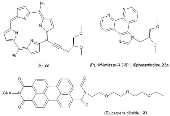A stabilizing effect (ΔTm = 10 °C) of electrostatic complementarity between the electron-deficient perylene diimide (B, 23, Chart 6) and the relatively electron-rich porphyrin (R), which serve as the nucleobases in the middle of the 16-mer GNA duplex 3′-TAAAAATHRTAATATT-2′/2′-ATTTTTABHATTATAA-3′ (H stands for the abasic site), has been reported [50]. However, while 2, 4 or 5 consecutive chromophores (arranged in a zipper-like inter-strand alternating fashion) provided an approximately cumulative effect (ΔTm = 16–25 °C), only ΔTm = 3 °C was observed for a set HRH/BHB.