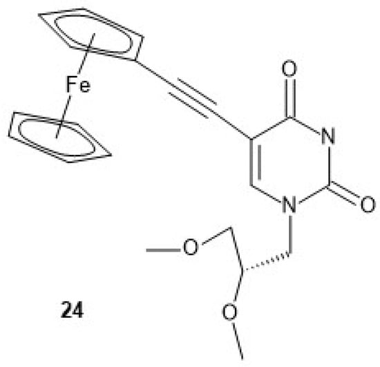 More recently, Kowalski and coworkers published the synthesis of a ferrocenyl-labeled analog of the nucleoside GNA-U (GNA-FcU, 24, Chart 7) [55]. Cyclic voltammetry studies of a chimeric dinucleoside phosphate (GNA-FcU)p(rA2′,3′-O,O-isopropylidene) revealed the presence of a one-electron ferrocenyl-centered redox wave. A half-wave potential of 99 mV against the FcH/FcH+ couple was found. The authors suggest a future application of GNA-FcU in the synthesis of redox-active self-assembling “molecular wires”.