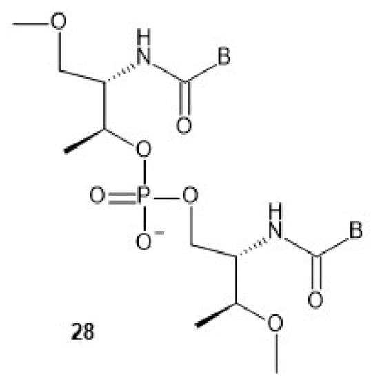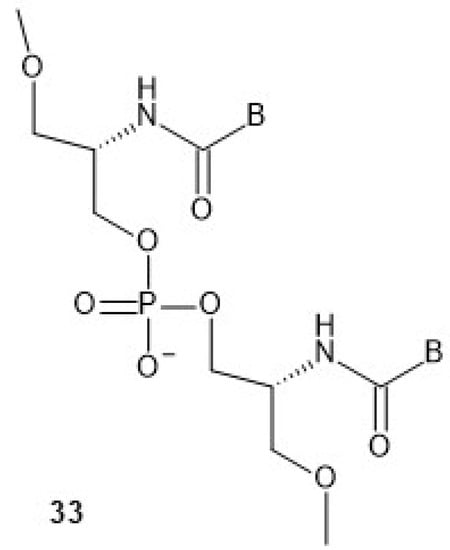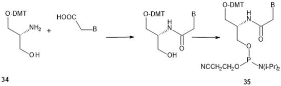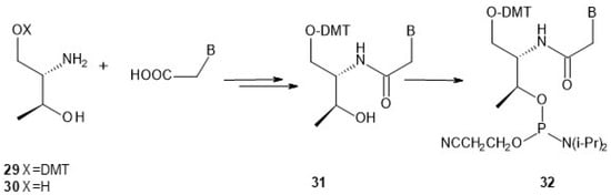 The nucleoside precursors of acyclic threoninol nucleic acid (D-aTNA, 28, Chart 9, a dinucleotide is shown) were prepared using DMT-protected D-threoninol (29, Scheme 6), except for the thymine derivative, for which unprotected D-threoninol 30 was used [57]. The amino groups were used to attach N1-carboxymethyl derivatives of the nucleobases CBz or T, or N9-carboxymethyl derivatives of ABz or GiBu under conditions known from peptide chemistry. The product containing a thymine nucleobase was tritylated and all four DMT-protected nucleosides 31 were routinely phosphitylated to yield the corresponding D-aTNA monomers 32.