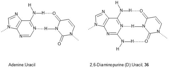 In the field of molecular biology, GNA oligomers have been tested as templates for template-dependent synthesis of DNA using the polymerases Taq, Bst, DeepVent (exo-), Therminator, Sequenase and SuperScript II DNA [42]. The chances of success were not good because GNA and DNA oligomers do not form stable duplexes. The DNA primer (5′-TAATACGACTCACTATAGGG-3′) was labeled at the 5′ end with 32P-phosphate and annealed to a DNA-GNA chimeric templates 3′-ATTATGCTGAGTGATATCCCatatcag-5′, or 3′-ATTATGCTGAGTGATATCCCDtDtcDgcDgtcA-5′, where lowercase letters denote GNA nucleotides and “D” stands for a diaminopurine nucleotide (see structure 36). For most polymerases, the primer extension process stalled after elongation of the primer by two or three deoxynucleotides. However, the Bst DNA polymerase catalyzed full-length DNA synthesis on a dodecamer GNA template. In another study, the ability of various DNA polymerases (vide supra) to use GNA triphosphates as substrates for GNA synthesis on DNA templates was investigated [43]. It was found that the Therminator DNA polymerase was able to extend the primer by incorporating two GNA units, whereas extension with up to five GNA nucleotides was much less efficient. Some improvement was achieved by using 5-propynyl-substituted GNA-C, where the propynyl substituent was assumed to enhance stacking interactions. This assumption was incorrect for a GNA-(5-propynyl-T) nucleotide.