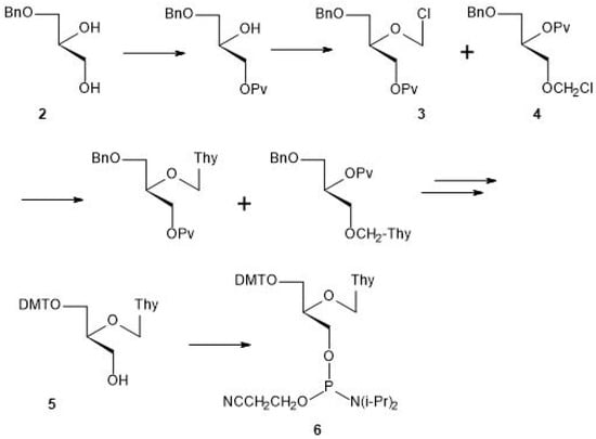 Flexible Nucleic Acids (FNA, 1, Chart 1, shown are dinucleotides) were one of the first proposed acyclic nucleotides for an evolutionary precursor to DNA and RNA, and were the first synthesized acyclic analogs of DNA. Since FNA are deprived of the 2′-carbon atom, that is otherwise part of the relatively rigid D-ribose ring present in the nucleosides of DNA or RNA series, their structural flexibility is virtually unrestricted. Only the anionic phosphate moieties provide some repulsive forces of the electrostatic nature, which work against the stacking interactions caused by the nucleobases. This first synthesis of the FNA-related acyclic nucleoside was reported by Schneider and Benner [3]. The multistep synthesis (Scheme 1) began with a 1-O-benzyl derivative of glycerol.