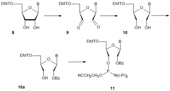 The unlocked nucleoside 10 (obtained in 88% yield) was then benzoylated, but the desired 2′-O-Bz compound (10a, isolated in 38% yield) was accompanied by the 3′-O-Bz regioisomer (17%). After routine phosphitylation of 10a, the required phosphoramidite monomer 11 (B=Thy) was obtained in good yield and used in the automated solid-phase synthesis of the above-mentioned oligomers. In 2009, the synthesis of other UNA-nucleosides 10 was published and good yields were reported (B=ABz: 73%, CAc: 64%, GiBu: 63%, U: 79%) [7]. The benzoylated derivatives 10a were obtained in 63–79% yields. The synthetic route to UNA was improved by the synthesis of 2′-O-TBDMS monomers [8].