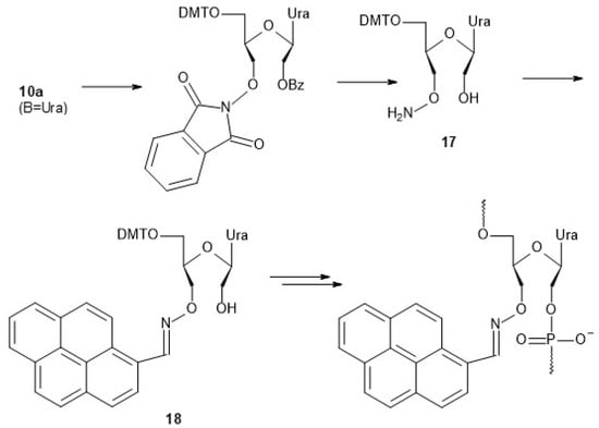 In the synthesis of a UNA-3′-O-amino-U nucleoside (17, Scheme 4; Note: 17 is not a 3′-deoxy-3′-amino compound), the previously developed synthon 10a (B=Ura) was used [33]. Its labeling with pyrene and the standard conversion of the resultant UNA-(5′-O-DMT- 3′-O-amino-pyrene)-U (18) into a phosphoramidite monomer allowed the preparation of oligomers containing this fluorescent pyrene probe. Thermal dissociation studies showed that the presence of UNA-(3′-O-amino-pyrene)-U in DNA or 2′-OMe RNA oligomers (21-nt long) resulted in increased thermal stability of duplexes with a DNA complement. Fluorescence spectroscopy studies indicated that the pyrenes were located in the minor grooves of the duplexes, and these results were confirmed by molecular modeling, CD, and UV/Vis absorption experiments. Pyrene–pyrene excimer signals were observed for oligomers bearing two or three pyrene-labeled units. Upon hybridization with the complementary DNA strand, the excimer signals disappeared, allowing such constructs to be used for fluorescence-based detection of mismatched hybridization. It was also found that the UNA-(3′-O-amino-pyrene)-U unit stabilizes triplexes under mildly acidic conditions and fluorescence emission was observed only at temperatures above the melting point of the triplex. Thus, the modification may help to detect triplex-forming double-stranded DNA sequences.