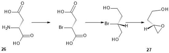 Apart from the acyclic structure, GNA nucleotides differ from DNA and RNA units in the number of atoms present in the backbone units. There are 5 atoms in GNA (O3′-C3′-C2′-O2′-P) and six atoms in natural nucleotides (O5′-C5′-C4′-C3-O3′-P). It has been suggested that the difference in linker length is one reason why GNA oligomers do not hybridize with DNA. Therefore, it was tempting to make a homolog of GNA with six atoms in the backbone, and this was carried out with the synthesis of Butyl Nucleic Acids (BuNA, 25, Chart 8) [56]. In the first attempt, the carboxyl groups of (S)-malic acid were reduced to yield the corresponding triol, in which two hydroxyl groups were protected using benzaldehyde dimethyl acetal. Then, the nucleobases were substituted for the third hydroxyl under the conditions of a Mitsunobu reaction. By this synthetic route, the intermediates bearing uracil, thymine and adenine were obtained in 40–60% yield, but the further workup was successful only for the uracil derivative, so the relevant scheme is not shown. The BuNA derivatives of Ade, Thy, Gua and Cyt were obtained starting from aspartic acid (26, Scheme 5), which was subjected to NH2⟶Br conversion (using an HNO2/HBr mixture), followed by a reduction of the carboxyl groups and epoxide ring closure.