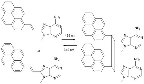 An interesting way to control the strength of SNA/RNA hybridization is based on the photochemically induced [2 + 2] cycloaddition of two 8-pyrenylvinyl adenine residues (37, Scheme 8) present in adjacent positions to each other in an SNA strand [72].