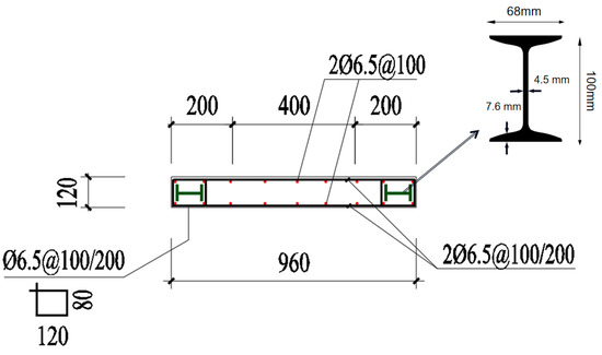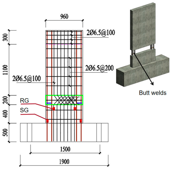 The plan view and the reinforcement layout of the fabricated concrete shear walls is shown in Figure 2. An I-shaped steel section is embedded in each end of the precast reinforced concrete shear wall and the corresponding locations of the footing. The I-shaped steel section runs through the whole height of the wall and the footing. The depth of the I-shaped steel section is 100 mm, the web thickness is 4.5 mm, the flange width is 63 mm, and the flange thickness is 7.6 mm, as shown in Figure 2. The prefabricated wall specimens have two rows of vertical reinforcement bars (D = 6.5 mm), one in the front and another in the back of the wall, uniformly spaced at 100 mm. Horizontal reinforcement bars (D = 6.5 mm) are placed in the wall to provide shear capacity. The interval of the horizontal bars is shown in Figure 3 and Figure 4. There is a stirrup of 120 × 80 mm (D = 6.5 mm) at the end of each layer of the horizontal rebars, as shown in Figure 2.