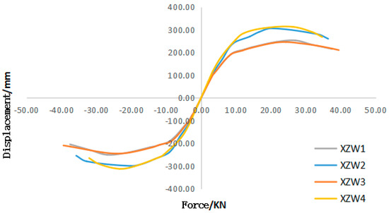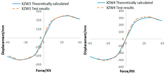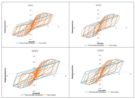 Based on the restoring force curves and hysteresis relationships obtained in Figure 13, the theoretical calculated hysteresis curves for wall specimens XZW 1 to 4 can be obtained by using the Dm and Pm values of each specimen from Table 4. The theoretical hysteresis curves of the restoring force model are compared with those from the test (Figure 14). From the comparison of each specimen, the four-line restoring force model proposed in this paper basically reflects the hysteresis characteristics of the specimens, as verified by the good fitting with the test results.