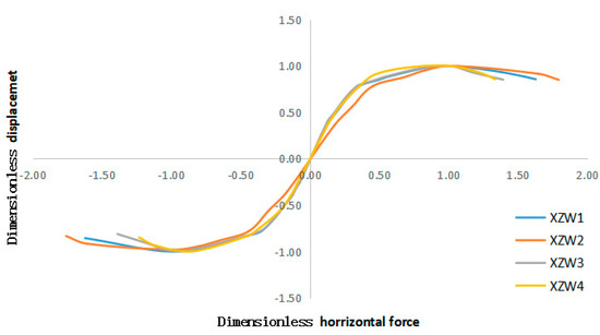 The dimensionless skeleton curve (Figure 8) is established by normalizing the load values by the maximum load and displacement; that is, the values at the cracking point, yielding point, maximum load point, and failure point are all divided by the value of the maximum load point. In the same dimension, the curves of each specimen converge and have similar changing characteristics. Therefore, on this basis, a changing broken line can be used to approximately express the change rule of the restoring force curve.