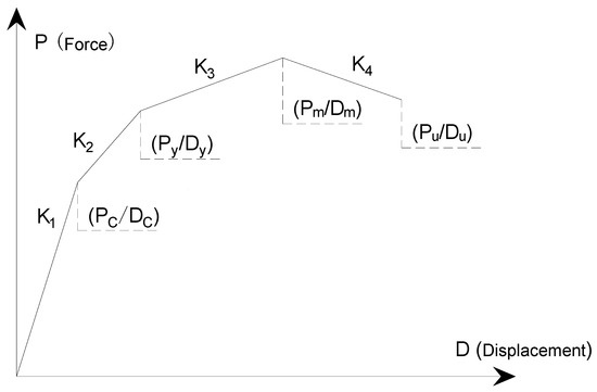 The obtained four-fold-line skeleton curve is expressed as Equation (1), and the relationships between load and stiffness are defined in Equations (2)–(5):