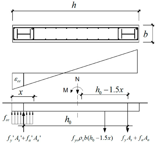 In this paper, in the prefabricated concrete shear wall with built-in steel sections, symmetrical reinforcements and steel sections are used to establish the equilibrium equation of the force under the ultimate state of the bearing capacity of the section [21], see Figure 10 and Equations (9) and (10). In the equilibrium equations, it is assumed that the reinforcement bars and steel sections in both the tension and compression sides have yielded under the ultimate state. As shown in Figure 10, under the axial load N and the moment M from the lateral load, the steel section (Aa) and the core reinforcements inside the stirrup (As) as well as the uniformly distributed vertical rebars in the tension zone provide tensile resistance, and the steel section (Aa′) and the core reinforcements (As′) as well as the concrete in the compression zone provide compressive resistance.