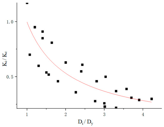 By measuring the wall-top deformation and the corresponding stiffness of each hysteresis loop after yielding, the ratio of the stiffness to the pre-cracking stiffness K1 and the ratio of the wall-top deformation to the yield displacement is determined. According to the test results of the four wall specimens, the displacement and corresponding stiffness of each hysteresis loop apex after yielding were obtained for all hysteresis curves. In Figure 12, the ratios of the stiffness after yielding to that before cracking (K1) was calculated as the y-axis values, and the ratio of the displacement at the apex of the hysteresis curve to the yielding displacement Dy was calculated as the x-axis coordinate values. By a nonlinear curve fitting (Figure 12), an equation of the post-yielding stiffness of the specimen can be obtained (Equation (11)).