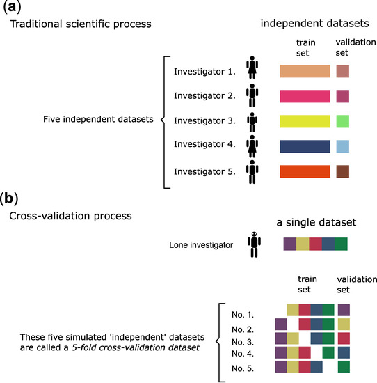 However, even this train-validation procedure may be less than optimal in real life. For example, because of inherent systematic errors during the experiments or if it just happens that the particular picking of data into train/validation sets skew results. Figure 4 illustrates how independent observations by different researchers solve the problem. However, in the medical field, this is often not possible, because the experiments may be too costly or there is simply not enough interest or resources to reproduce results.