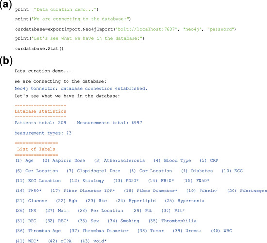 ‘PyTanito’ software in actual use—example of a ‘data curation’ role use. (a) The input: these are code lines in Python for database import and for printing database statistics. (b) The output of the software in response to the commands in (a) lists the number of patients in our dataset 12 (209 total), as well as the number of measurements collected (6997 total), and as a bonus, it lists the type of measurements available for further analysis (43 different types). The asterisk (*) after a parameter name indicates that the parameter was measured using a pathological blood clot, unlike the rest, which are from ordinary blood samples.