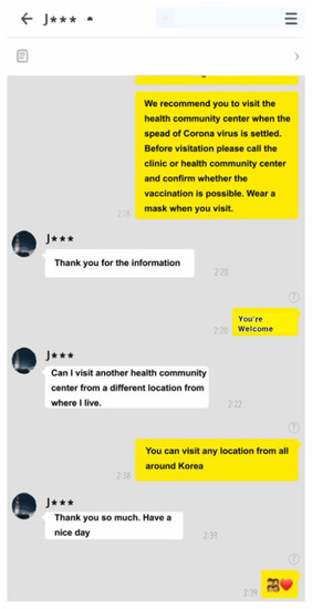 Through this study, parents who missed their vaccination scheduled were interviewed to determine the functional needs that could be applied to upgrade the chatbot. Through the Kakao Plus Friend Service, notification messages were sent automatically to parents when their child’s vaccination date was imminent, and users were provided weekly information related to vaccinations regularly, including articles, newsletters, and webtoons. The service also included information about the location of the nearest vaccination center and local healthcare institutions. The most important factor for increasing child vaccinations seemed to be providing accurate information promptly.
