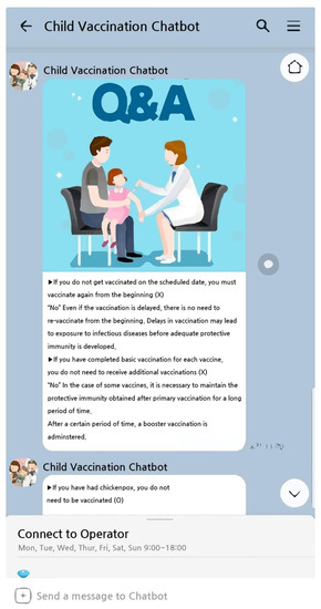 However, the importance of vaccination management for children is easily neglected and research on vaccination has been limited to studies mainly on vaccination awareness and satisfaction, as well as on vaccination status and related factors [9,10,11,12,13]. Few studies have been conducted on chatbots in this context. Awareness and dissemination of information could potentially improve if parents used technical tools, such as chatbots, when raising their children [14]. Therefore, receiving vaccination information through a chatbot channel is expected to contribute to boosting vaccination rates because relevant information can be provided more effectively than when using traditional methods. The purpose of this study is to develop a real-time consultation messenger service chatbot for vaccination questions and answers. We made the chatbot available to child-raising parents and evaluated its effect on the score changes for vaccination information, motivation, self-efficacy, and vaccination behavioral intention.
