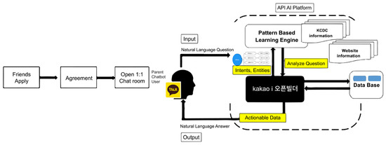 During the first testing stage, the dialogue content of the prototype chatbot was constructed using Dialogflow, supported by Google. Dialogflow is a convenient program which can apply natural language learning to chatbot implementation and can be linked to Kakao i Open Builder [19]. Through the Dialogflow program, keywords for 17 infectious diseases and 17 types of vaccines suggested by the KCDC website were included. By entering the keywords can lead to finding nearby health centers, vaccination schedules, nationally designated vaccinations, other vaccinations, and information regarding vaccination medical institutions. Representations of the child vaccination chatbot based on Kakao Plus Friend are shown in Figure 1, Figure 2, Figure 3 and Figure 4. If the candidates agreed to participate, they were registered, and a survey was sent to a 1:1 chat room. The structure of the chatbot is shown in Figure 5. The child vaccination chatbot service scenario is presented in Table 2.