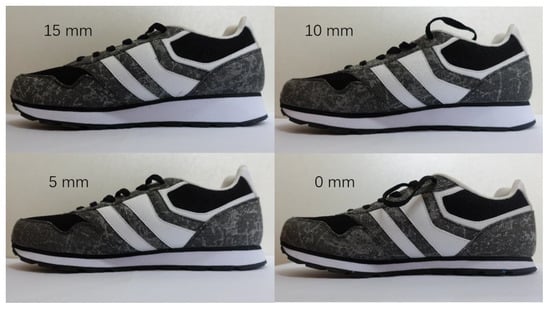 The participant was instructed to run in shoes with drops at 15 mm, 10 mm, and 5 mm, and without a drop (Figure 1), referred to in the current study as the shoe condition, in a random order. All running shoes had identical appearances and structures and were made from the same material with a forefoot part 12 mm in thickness. In each running test, the participant was instructed to run on a 20-m runway at 4.0 ± 0.2 m/s in each shoe condition. Each participant completed three successful tests for each shoe. A successful test was defined as a test in which the participants had no less than six steps before and after the entire right foot stepped on a force plate without any step length adjustment.