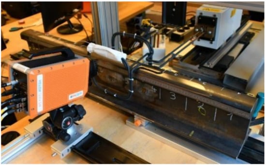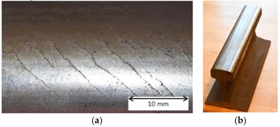 Nowadays railway rails are usually tested by ultrasound or by eddy current testing methods in order to detect rail defects []. Additionally, visual inspection, at least in laboratory conditions, can be very helpful to characterize the rail damage []. The traditional ultrasound testing requires a coupling medium such as water in order to induce the ultrasonic waves in the work-piece to be tested. Novel techniques were developed to generate ultrasonic waves without a coupling medium, as e.g., it has been demonstrated that electromagnetic acoustic transducers (EMAT) can be used to induce Rayleigh surface waves in the rail for detecting defects []. It is also possible to generate ultrasonic waves by laser pulses, which were presented for defect detection in railway axles and wheels [,].