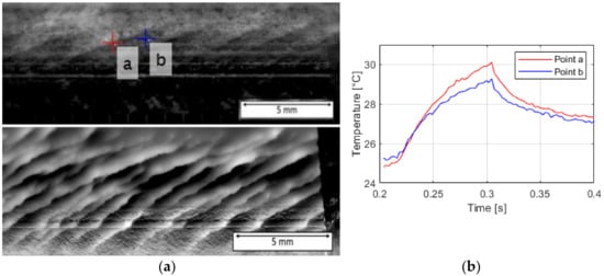 The IR camera records the surface temperature during the heating pulse as well as the cooling period after switching off the heating. For the desired crack detection a small temperature increase of 1–2 °C is enough, as can be seen in Figure 2b. Figure 2a shows that cracks on the surface are slightly more heated than the surrounding material. However, it is difficult to detect head checks in a single temperature image as e.g., in the top image of Figure 2a.