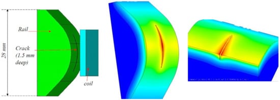 The simulation was set up using 3D hexahedral grids with 20-node elements. The size of the grid was about 0.01 mm in the region close to the surface and around the crack, and the grid size continuously increased towards the regions far away from the crack with a maximum element size of 0.6 mm. The electromagnetic part of the model consists of 296,000 elements, of which 134,000 are modeling the rail piece, 12,000 the induction coil and 150,000 the surrounding air. The thermal modelling was only performed for the work-piece part; the elements of the coil and the air were not included in the thermal calculation.