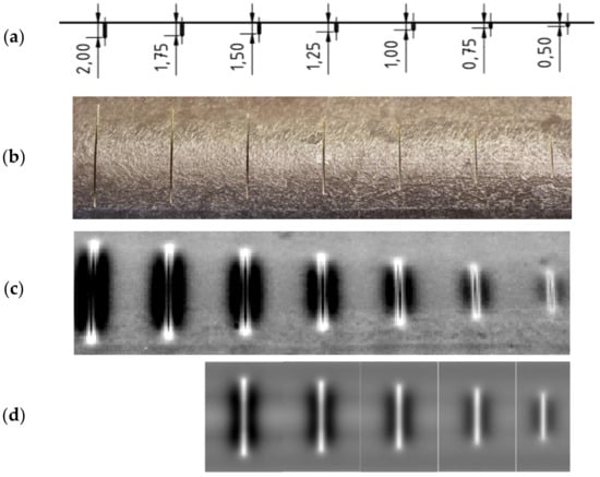 (a) CAD drawing of the EDM-cuts; (b) photo of EDM-cuts with different penetration angles; (c) phase image of EDM-cuts after 0.1 s inductive heating pulse; (d) simulation results of the slanted artificial cracks.