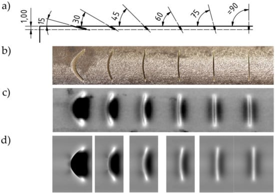 Figure 5 shows the results for the other gauge corner on the second side of the reference rail piece RP01. On this side the defect depths of all EDM cuts are identically 1 mm and the inclination angle varies between 90° (perpendicular cut) and 15°, see Figure 5a.
