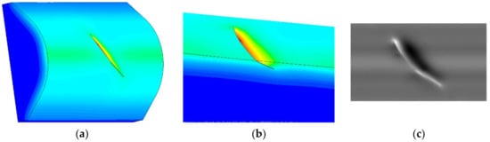 In Figure 7 simulation results are presented for a crack with α = 45° and β = 30°. Figure 7a shows the simulated temperature distribution after 0.1 s inductive heating pulse and in Figure 7b half of the model is presented, whereby the inclination angle and the temperature distribution below the surface are also visible. A phase image is calculated from the simulated temporal change of the temperature, in the same way as it is done for the measurements. This image (Figure 7c) shows a good agreement with the experimental results of head checks.