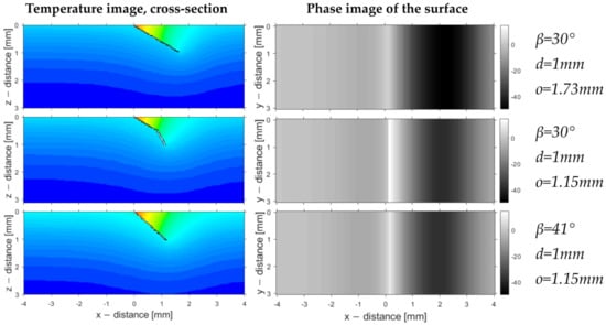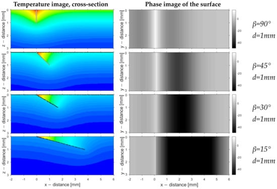 Further simulations were carried out to investigate how the inclination angle below the surface affects the phase images. In Figure 8 the temperature and phase images are compared for cracks with 1 mm depth but with different angles. The images on the top row show the results for a vertical crack (β = 90°). In this case the temperature and phase distribution are symmetrical around the crack position at x = 0 mm. As the inclination angle decreases, the length of the crack increases to d/sin(β) and the overlapped length o = d/tan(β). In the phase image this overlapping can be easily recognized: due to the small inclination angle the heat is captured for longer in this region, causing a low phase value. It is easy to see that the width of the low phase value region corresponds well to the width of the overlapped region. This gives the possibility of recognizing at the surface of the phase image in which direction the crack is inclined and how wide the overlapped region is.