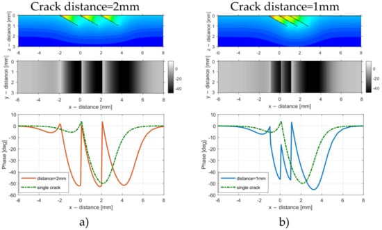 Simulation results for three cracks with d = 1 mm depth and inclination angle of β = 30°. In figures (a) and (b) at the top: temperature distribution in the cross-section; mid: phase distribution at the surface; bottom: phase profile through the cracks at the surface along the x axis. (a): distance between the cracks is 2 mm, therefore they do not overlap each other below the surface; (b): distance of the cracks is 1 mm and overlapping each other in the depth.
