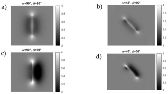 Simulated phase images for cracks with d = 1 mm depth and l = 6 mm length at the surface with different inclination angles at and below the surface. (a): the crack is perpendicular to the gauge corner (α = 90°) and it is perpendicular to the surface (β = 90°); (b): the crack has an angle of 45° (α) to the gauge corner and it is perpendicular to the surface (β = 90°); (c): the crack is perpendicular to the gauge corner (α = 90°) and it has an angle of 30° to the surface (β); (d): the crack has an angle of 45° (α) to the gauge corner and it has an angle of 30° to the surface (β).