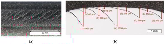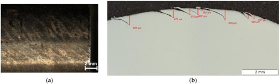 - RP04: Specimen RP04 is a cut-out piece of a rail with a rail grade R350HT, see Figure 14a. It was tested on the rail-wheel test rig at voestalpine Rail Technology GmbH []. The travelling direction was from the right to left, therefore the head checks have an orientation of NE-SW and the inclination angle α has a positive sign. A micrograph of the side view shows head checks with a maximum length of 1675 µm and a maximum penetration depth of 1050 µm, see Figure 14b.